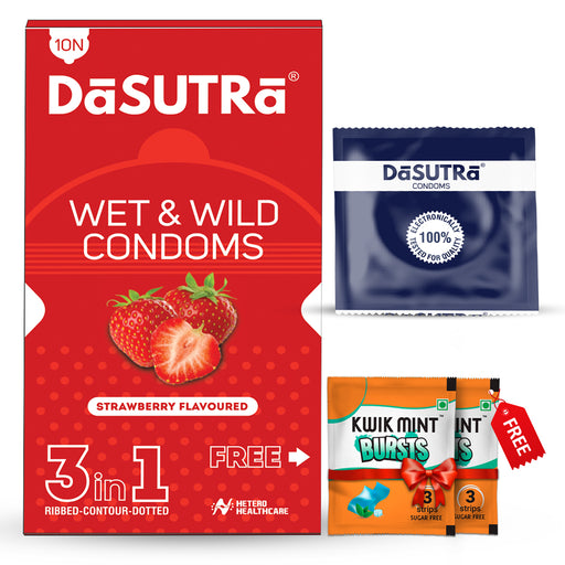 DaSutra Wet & Wild Condoms - 10's Pack Lubricated, Ribbed, and Dotted - Strawberry Flavour